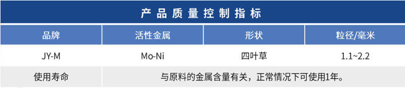 JY-M催化劑是一種重油加氫脫金屬催化劑。作為固定床重油加氫處理工藝中的支撐催化劑,具有孔徑大、孔徑大、酸性弱等特點,可去除加氫原料中的金屬雜質(zhì),防止反應(yīng)器床壓降增大,保護下游。主催化劑作用良好,性能優(yōu)于同類進口催化劑。 JY-M1型催化劑主要去除金屬雜質(zhì)并兼顧部分脫硫功能,穩(wěn)定性好,金屬容量強,可達自重的90%。 JY-M2和JY-M3催化劑脫金屬脫硫活性高,具有良好的金屬容量,可達自重的80%。